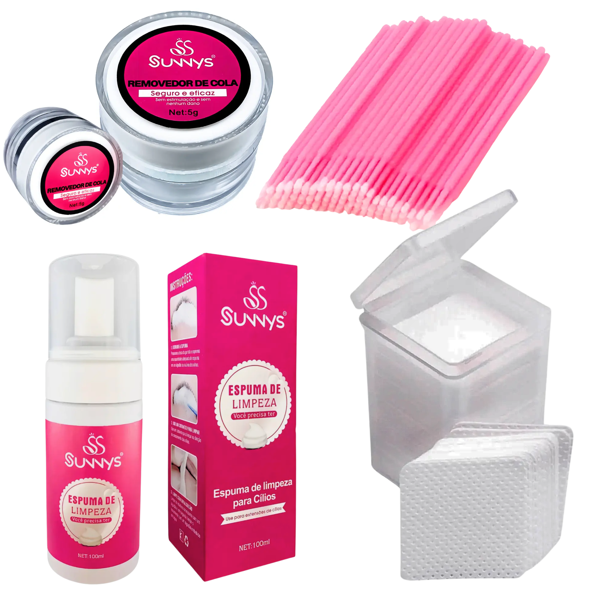 - Espuma de Limpeza Sunnys (100ml): O segredo para uma base perfeita! Fórmula hipoalergênica que remove oleosidade e resíduos sem irritar os olhos. Garante que a cola adira com muito mais força.