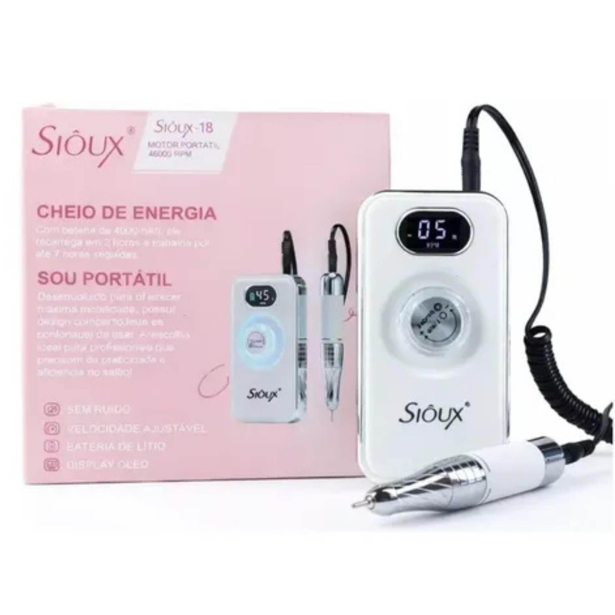 Lixadeira Motor Portátil Sem Fio Sioux-18 – Potência, Mobilidade e Conforto para Nail Designers A Lixadeira Sioux-18 foi desenvolvida para profissionais que buscam alto desempenho, mobilidade e conforto durante longas jornadas de trabalho. Com design moderno e tecnologia avançada, ela oferece a combinação perfeita entre potência, autonomia e praticidade para o dia a dia no atendimento.