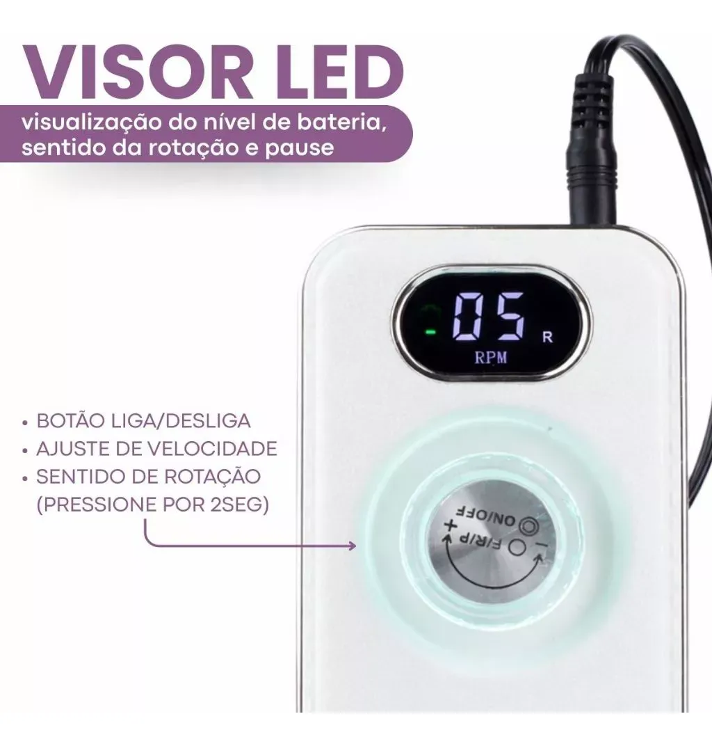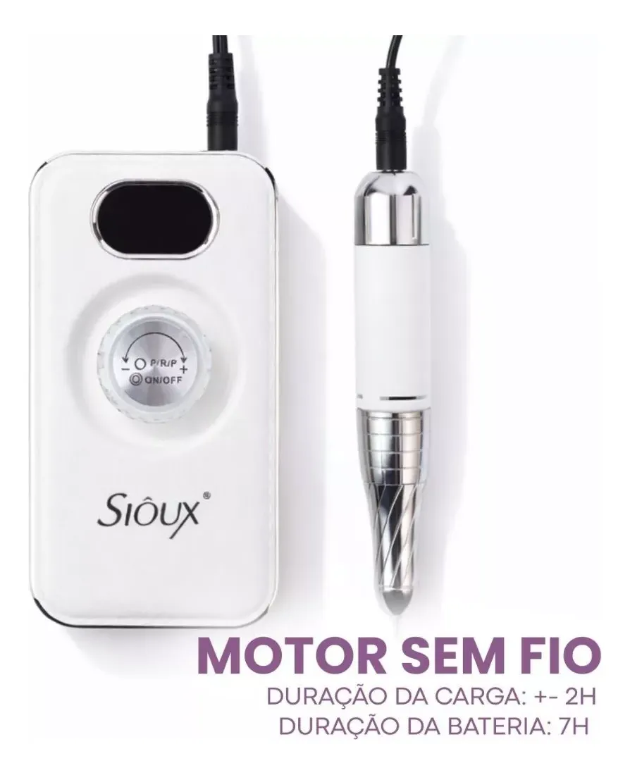 Um dos grandes diferenciais do equipamento é sua bateria de longa duração, que oferece até 7 horas de uso contínuo, ideal para profissionais que atendem diversas clientes ao longo do dia. Além disso, o tempo de carregamento é de apenas 2 horas, garantindo que o equipamento esteja sempre pronto para uso. A lixadeira conta também com visor digital de velocidade, permitindo acompanhar e ajustar a rotação com facilidade e precisão. Com 36W de potência, o motor entrega desempenho forte e estável, mesmo em procedimentos que exigem maior esforço. Projetada pensando no conforto da profissional, a Sioux-18 é leve, silenciosa e ergonômica, reduzindo o cansaço durante o uso prolongado e proporcionando uma experiência de trabalho muito mais confortável. Destaques do Produto: – Velocidade de até 45.000 RPM – Bateria com até 7 horas de duração – Carregamento rápido em apenas 2 horas – 36W de potência para alto desempenho – Visor digital de velocidade – Controle de rotação preciso – Sem fio – mais liberdade de movimento – Motor silencioso – Leve, ergonômica e confortável para uso profissional A Sioux-18 é a escolha ideal para nail designers que buscam tecnologia, mobilidade e performance profissional em um único equipamento. Ideal para elevar o nível dos seus atendimentos com mais praticidade, eficiência e conforto.